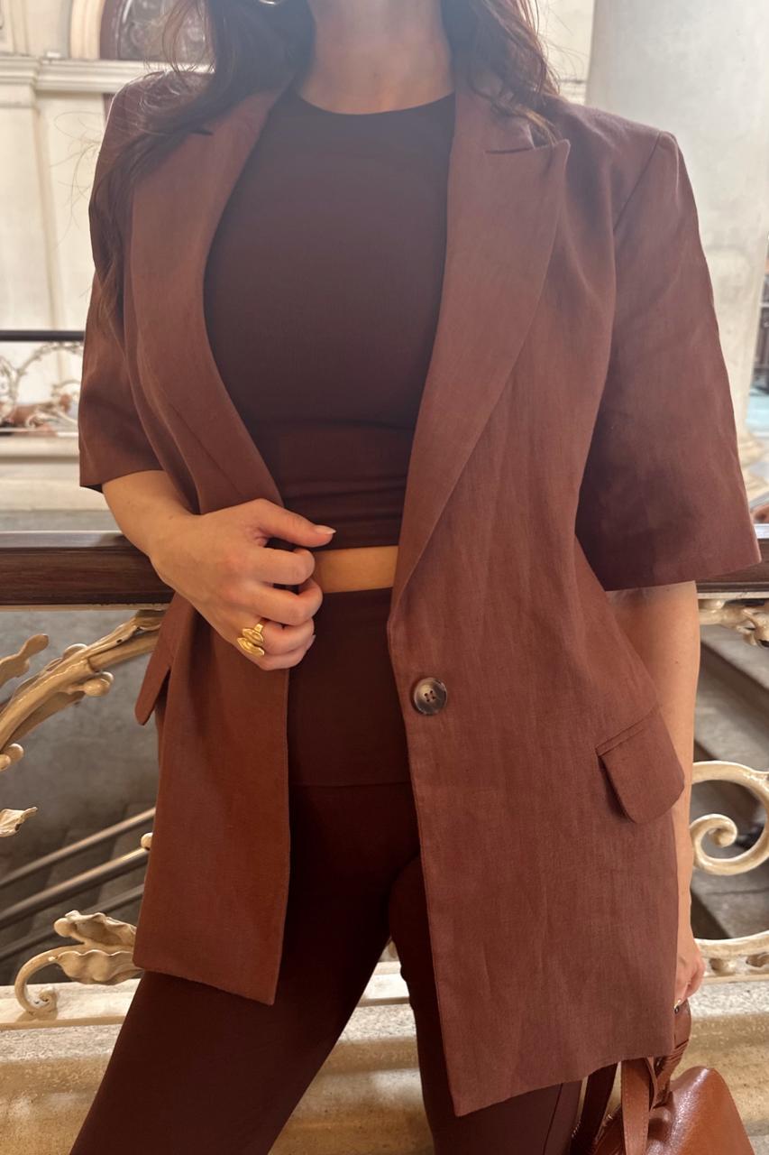 blazer 100% linho manga curta respiro de luz, forro 100% viscose sofisticado e leve, este blazer de linho puro com mangas curtas é ideal para composições elegantes em dias mais quentes. o forro em viscose garante conforto e caimento impecável, enquanto o tom areia adiciona versatilidade e charme atemporal. composição: 100% linho e forro 100% viscose.