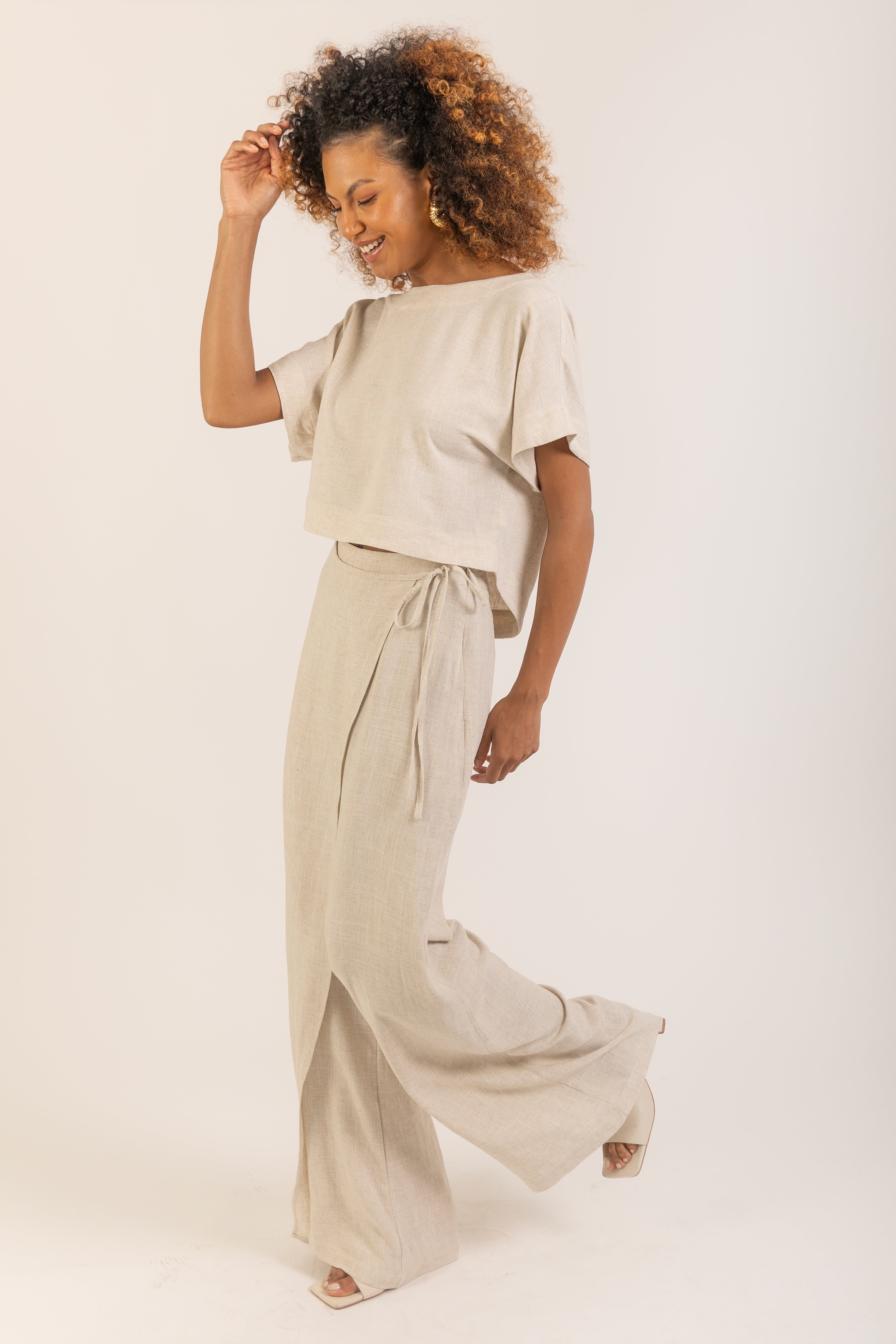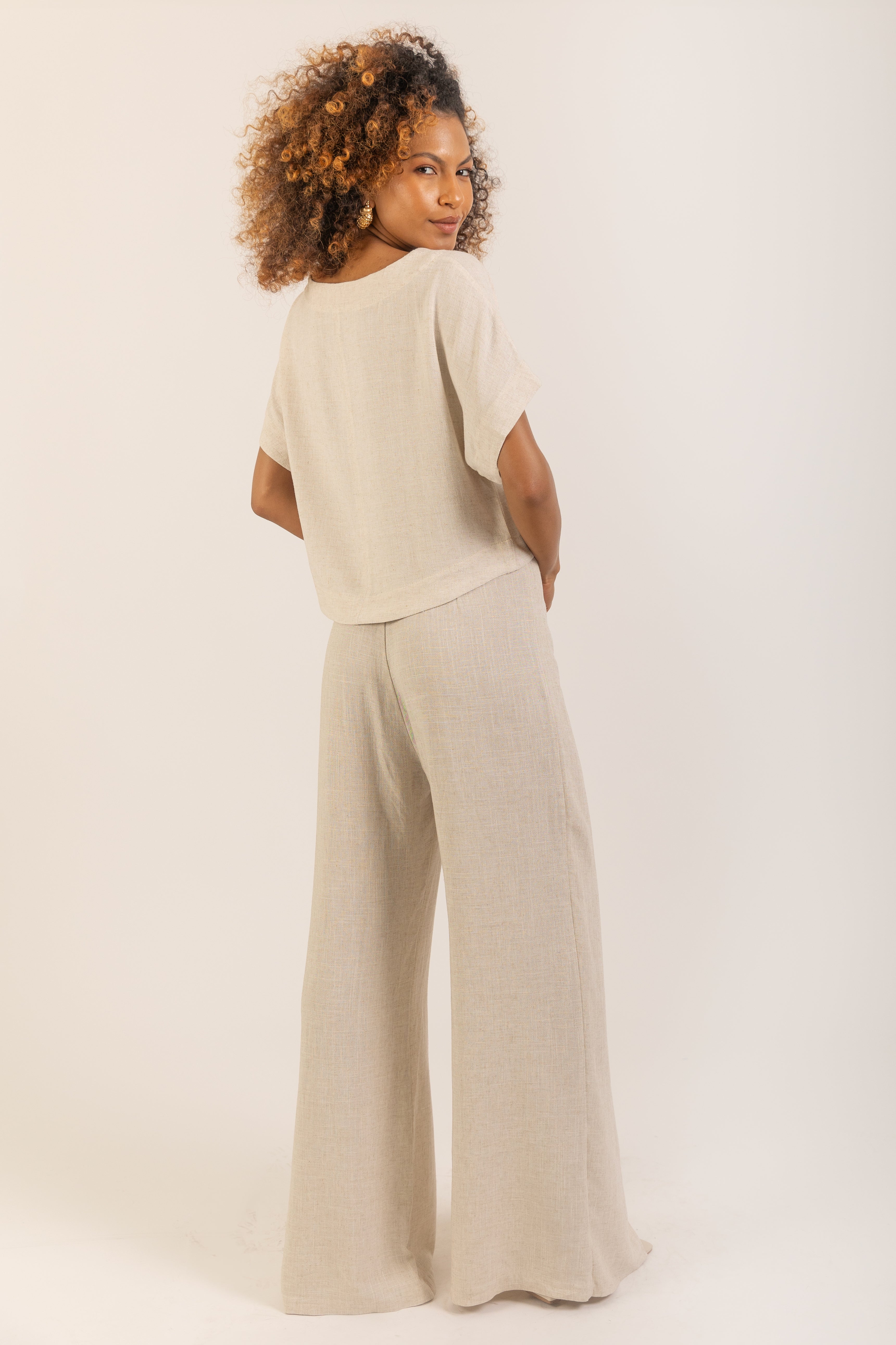 blusa ampla e sofisticada, confeccionada em tecido leve para um caimento fluido e confortável. Sua modelagem solta proporciona liberdade de movimento e um toque moderno ao visual. O diferencial fica por conta do detalhe nas mangas, que adiciona um toque sutil e elegante à peça. composição: 75% viscose e 25%linho