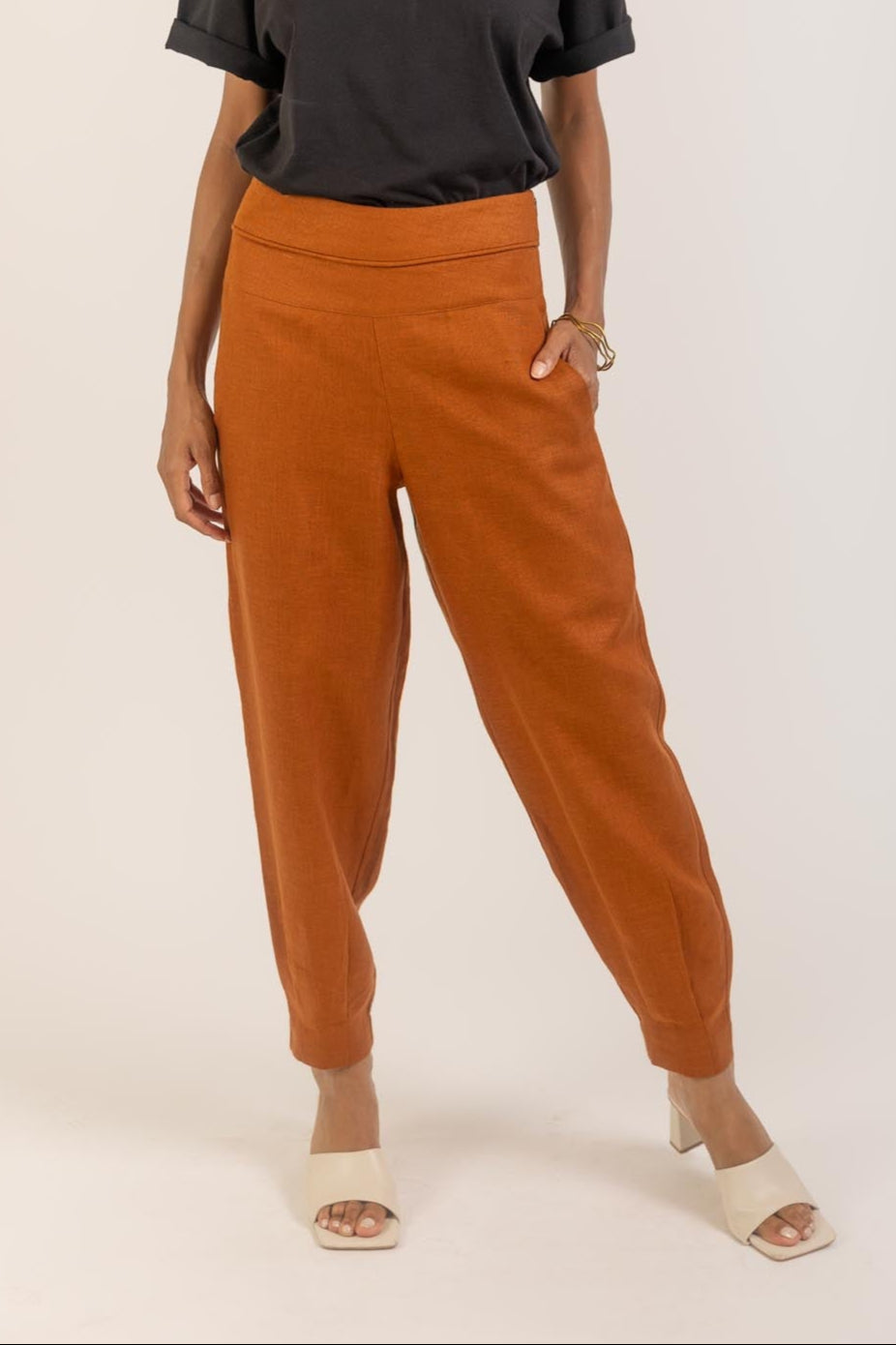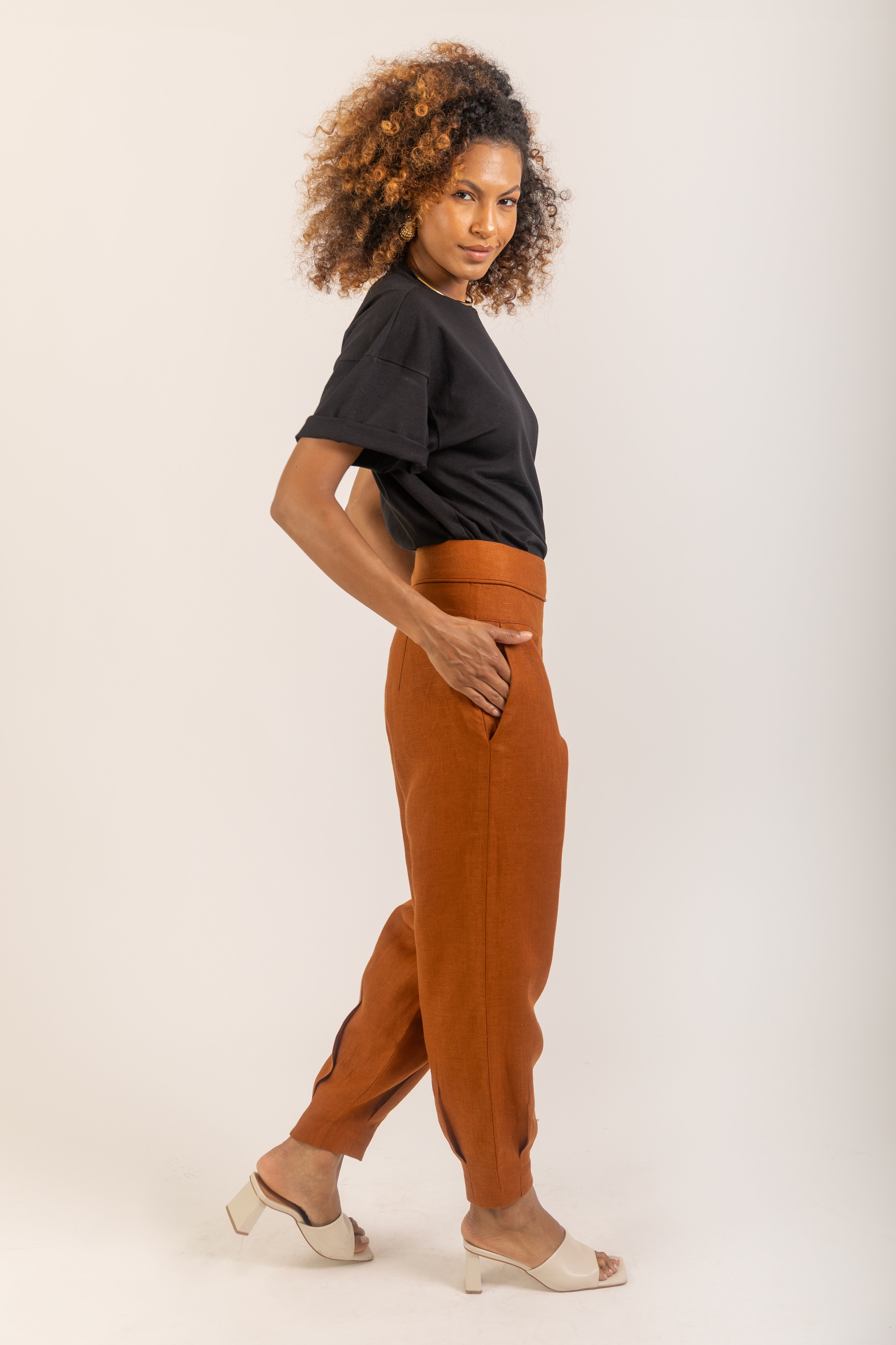 calça confeccionada em 100% linho, com modelagem afunilada, com bolsos faca, zíper de metal na lateral, pregas nas barras e detalhe no cós com vivo encapado que traz toda uma diferenciada para a peça. composição: 100% linho