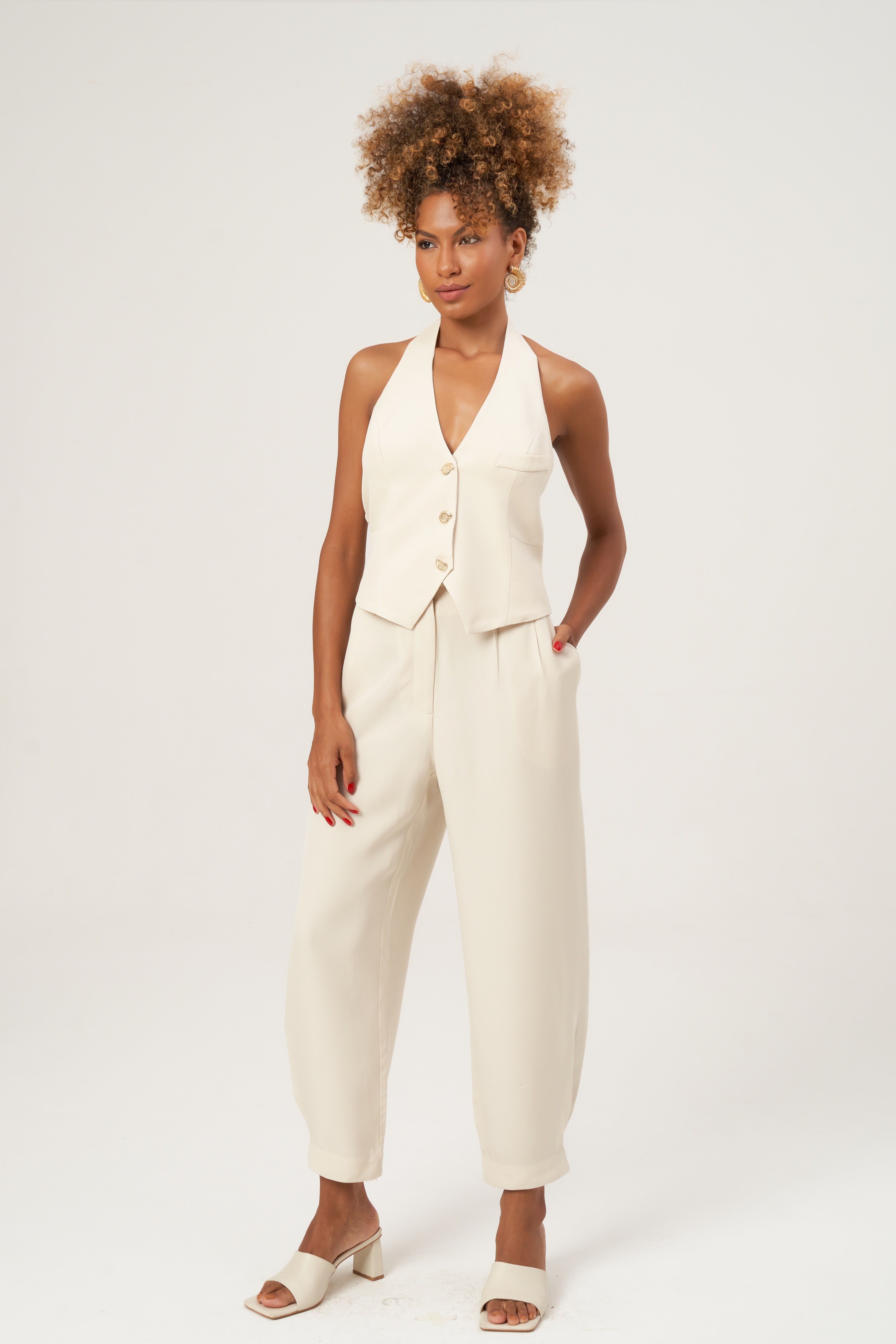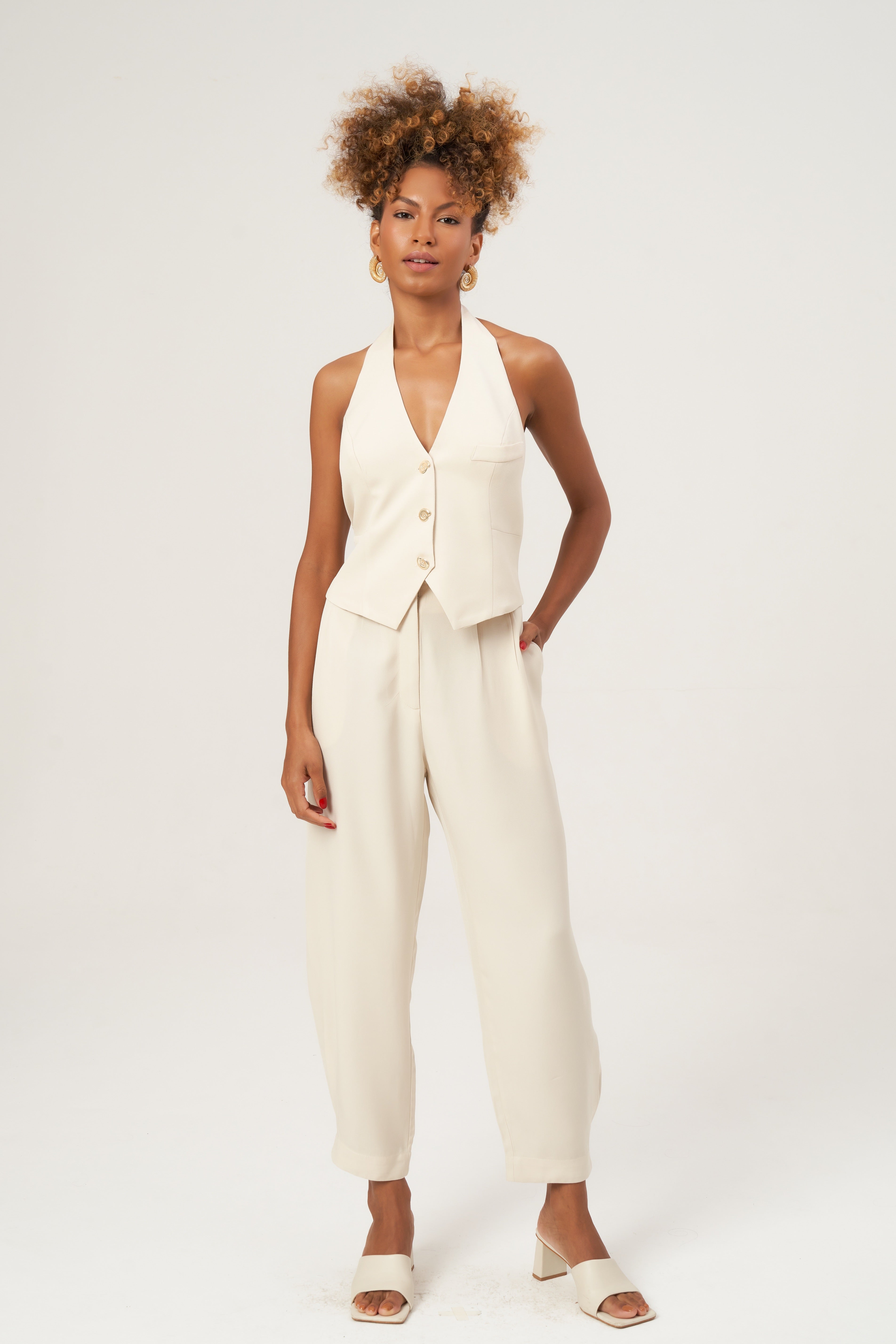 uma calça levemente afunilada, confeccionada em tecido leve, proporcionando conforto e um caimento impecável. o zíper frontal adiciona um toque moderno e prático, enquanto os bolsos nas laterais oferecem funcionalidade sem perder o estilo.