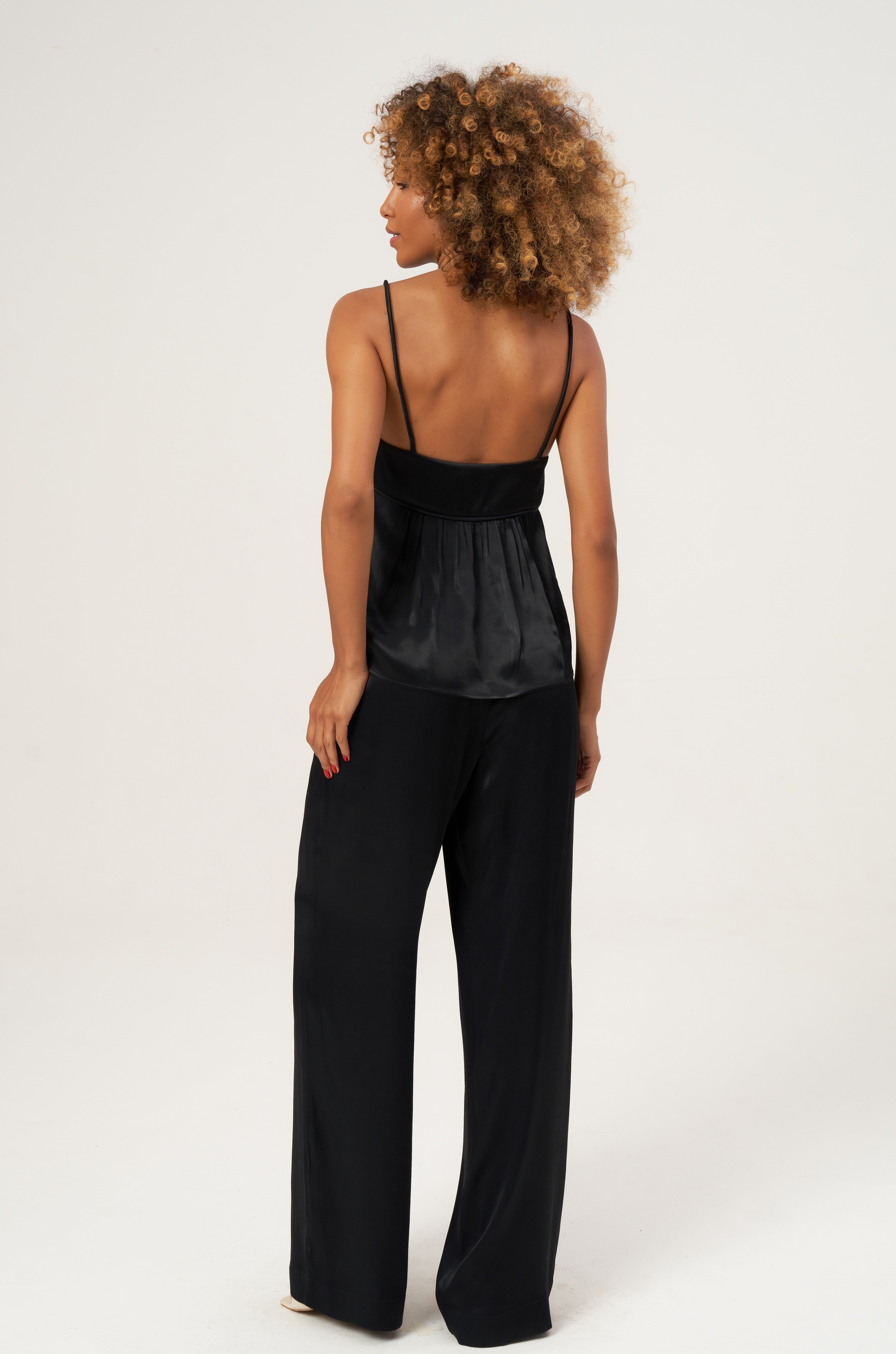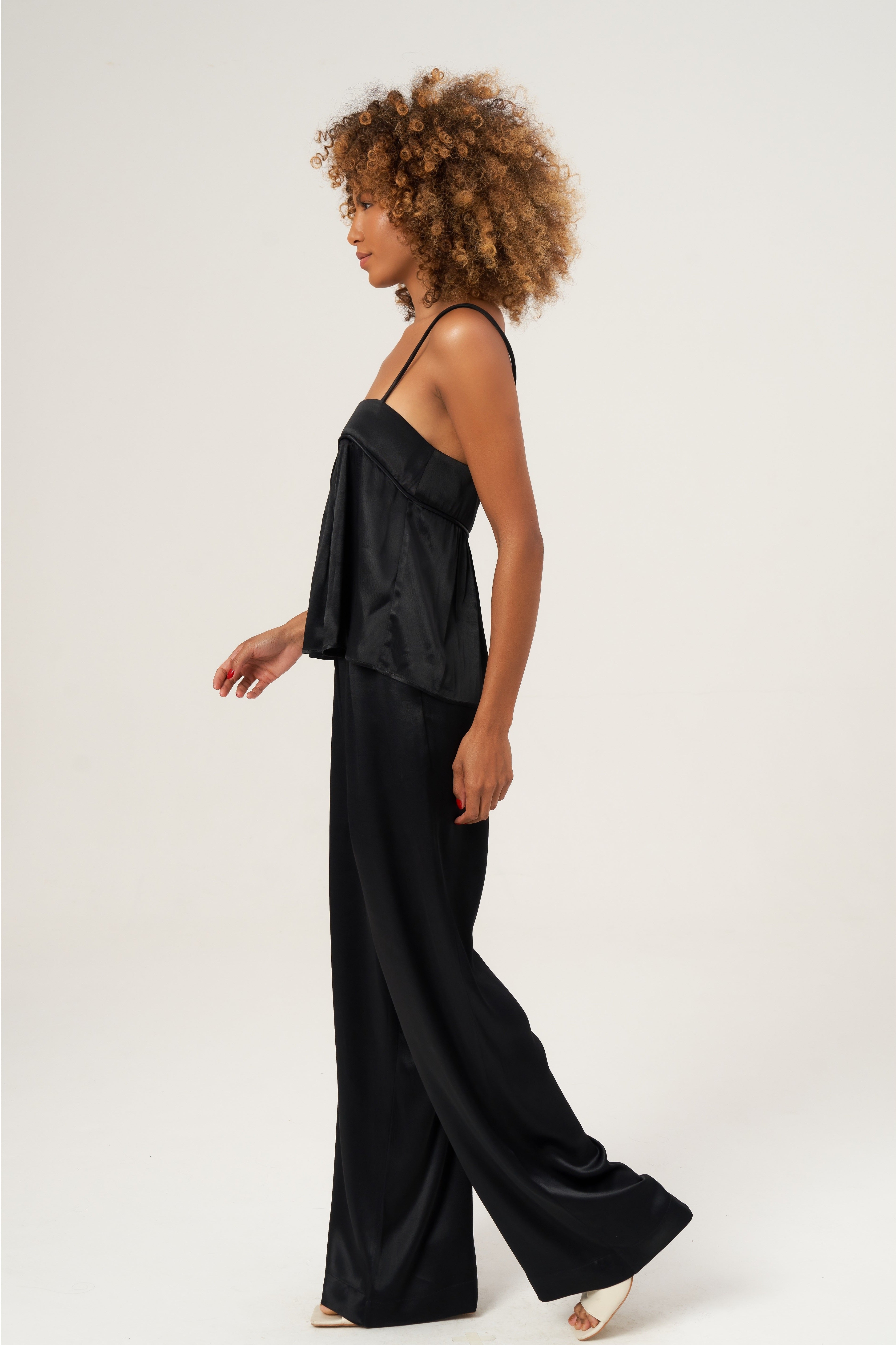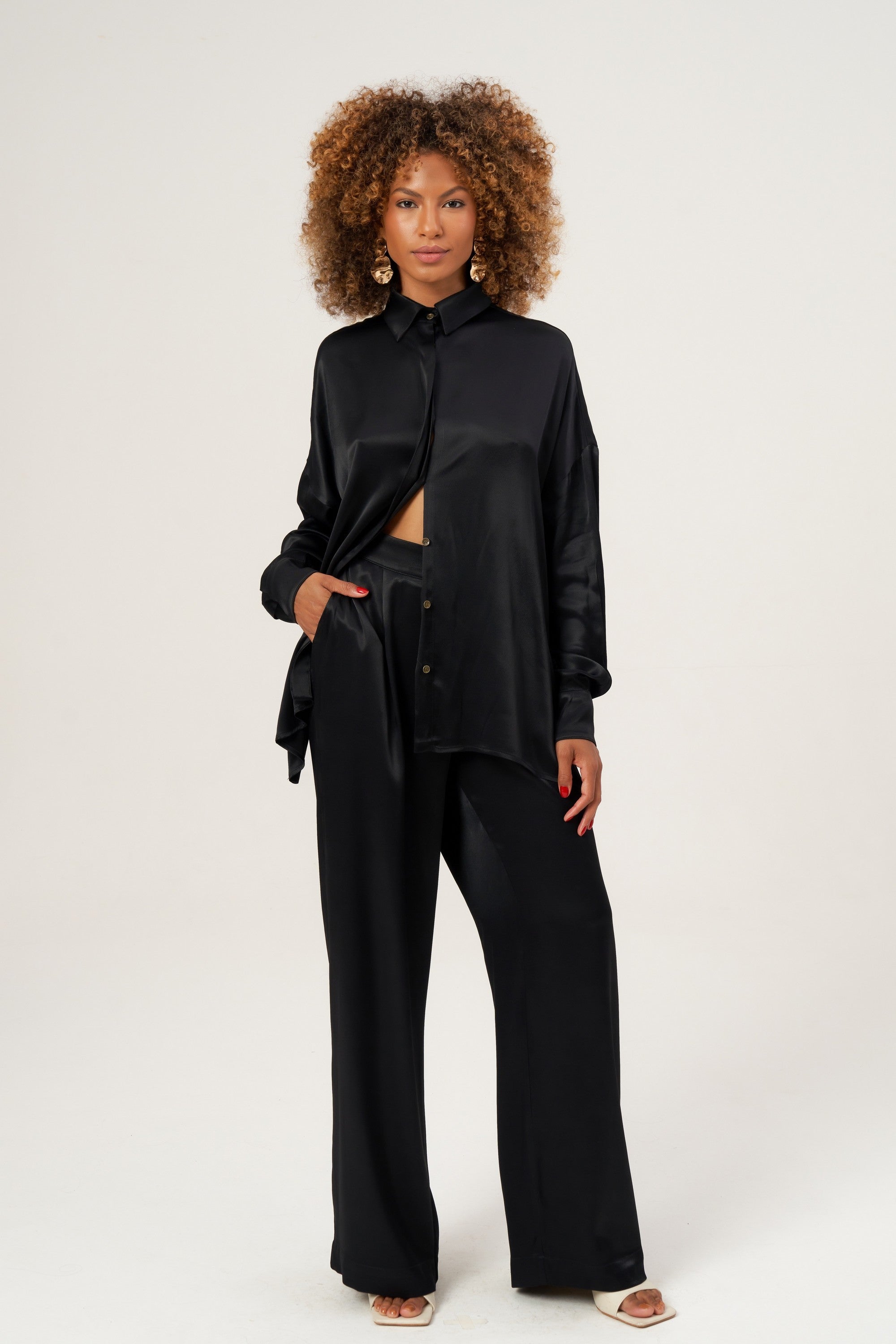 calça pantalona de caimento impecável, combinando elegância e fluidez. O ziper invisível preserva a sofisticação da peça garantindo um acabamento discreto e impecável. Atemporal e versátil, adapta-se com naturalidade a diferentes estilos, proporcionando leveza e conforto absoluto.