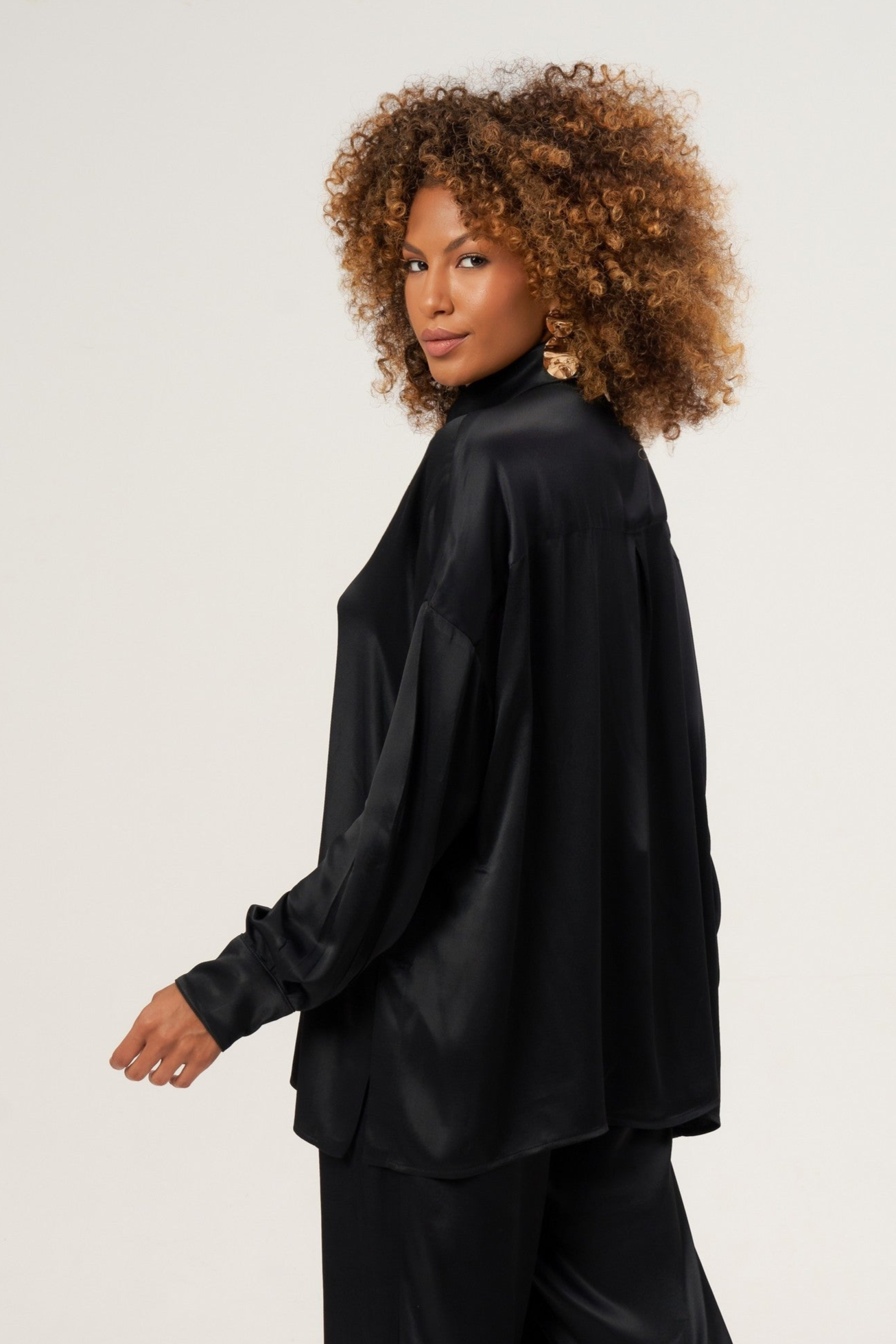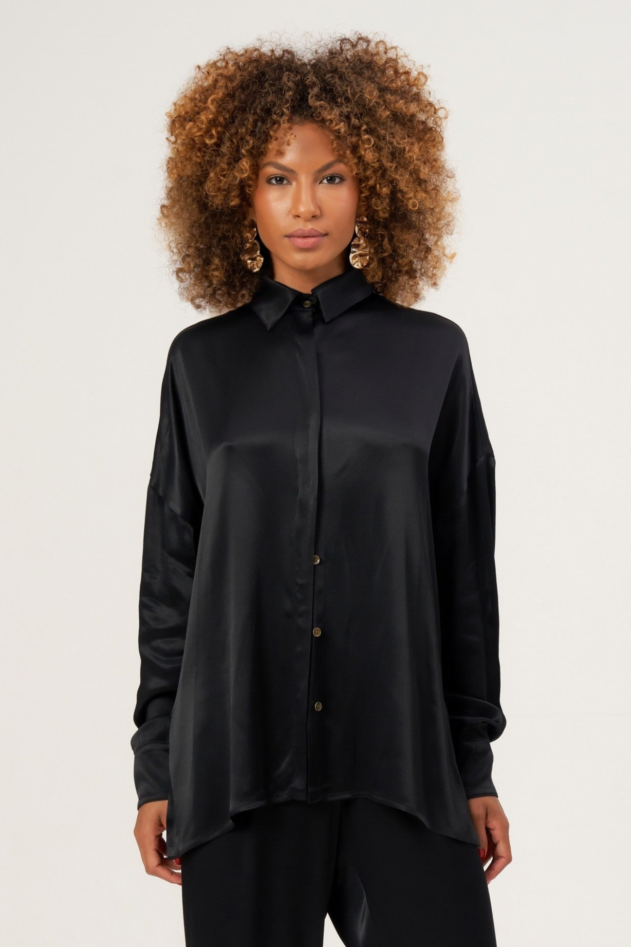 uma camisa de modelagem ampla, confeccionada em tecido levemente acetinado que confere um brilho sutil e sofisticado. As aberturas nas laterais adicionam um toque moderno e fluido, permitindo liberdade de movimento e leveza ao visual.