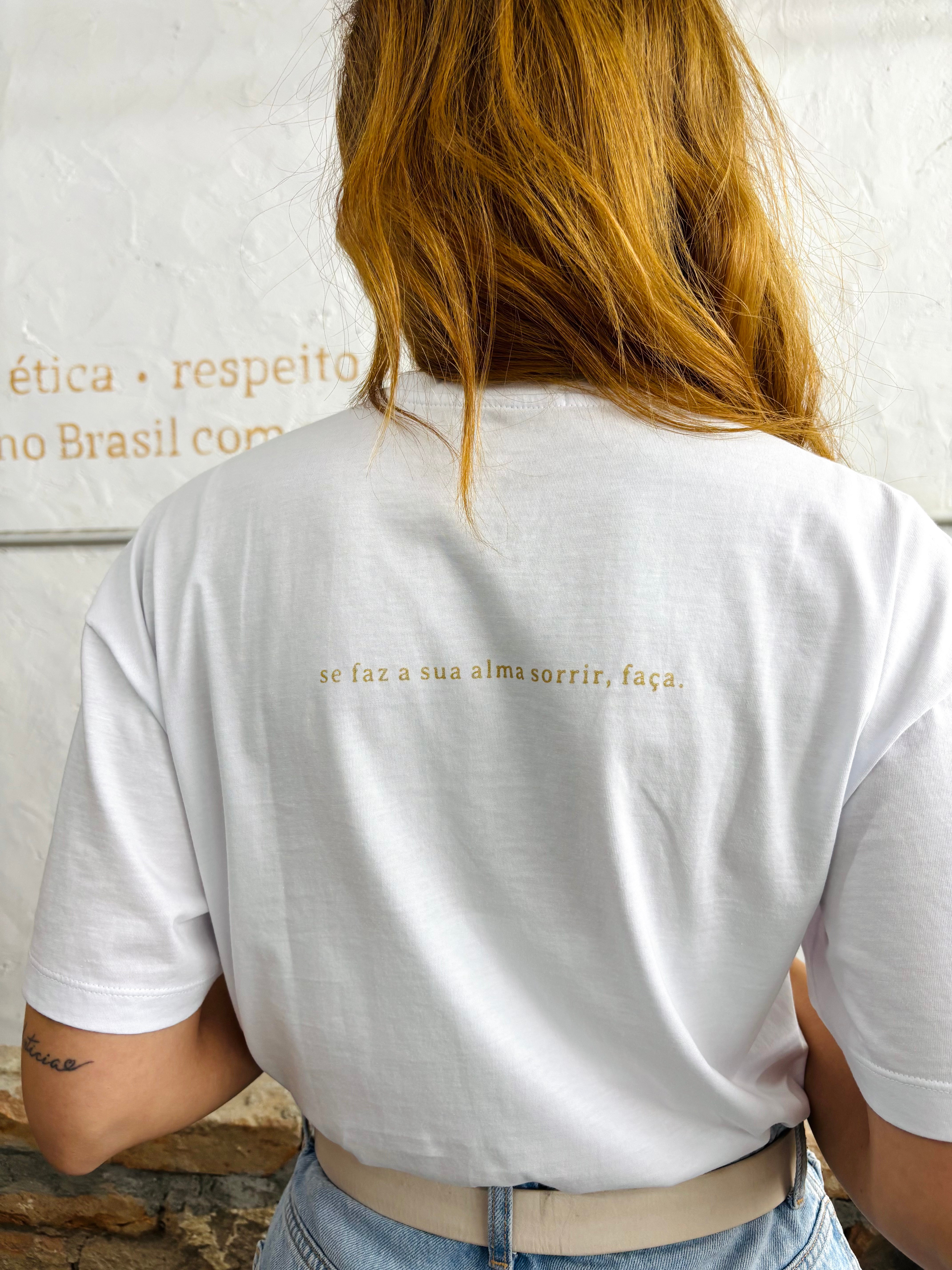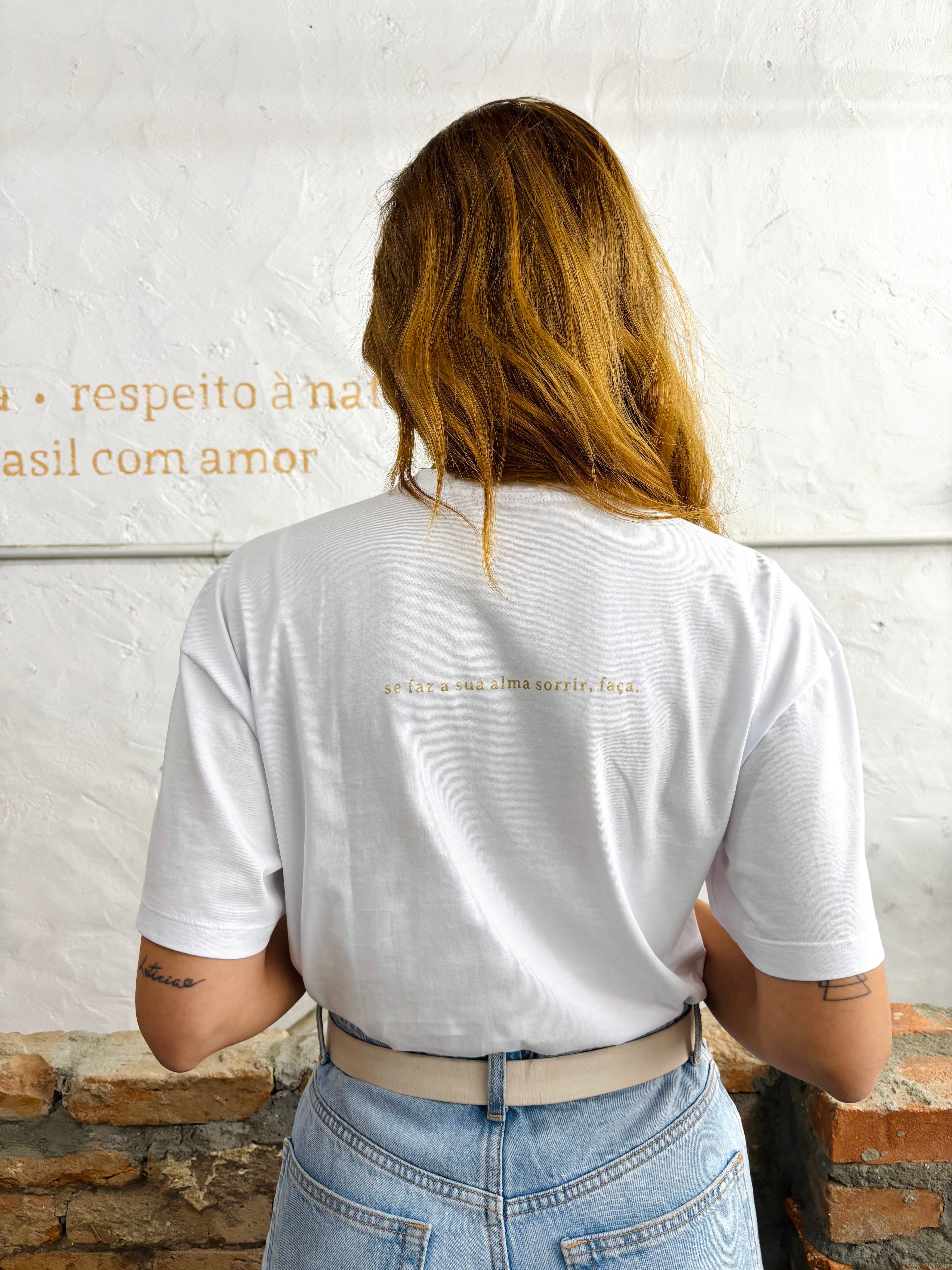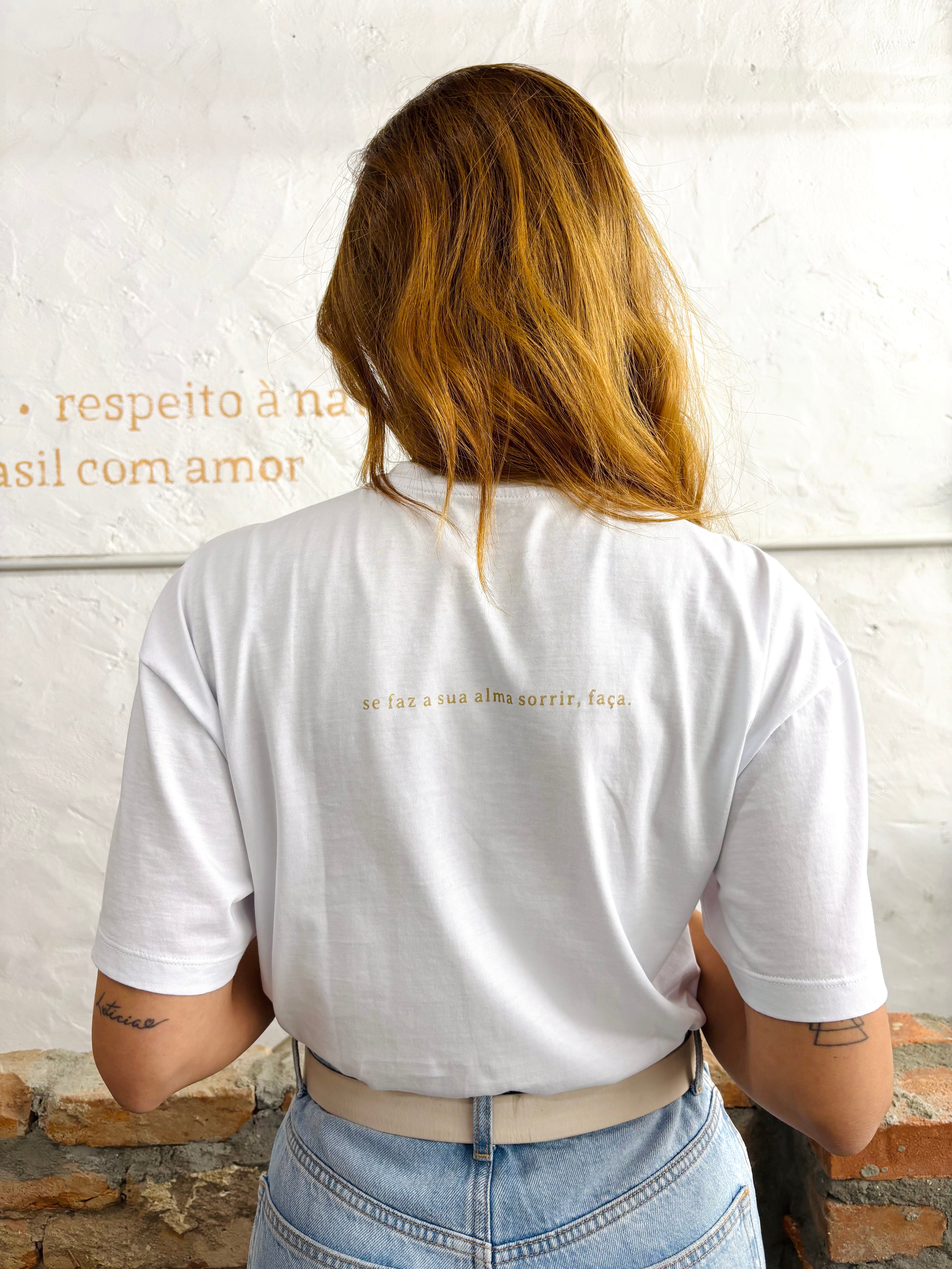 camiseta se faz a sua alma sorrir, faça branca - collab gabi stapff