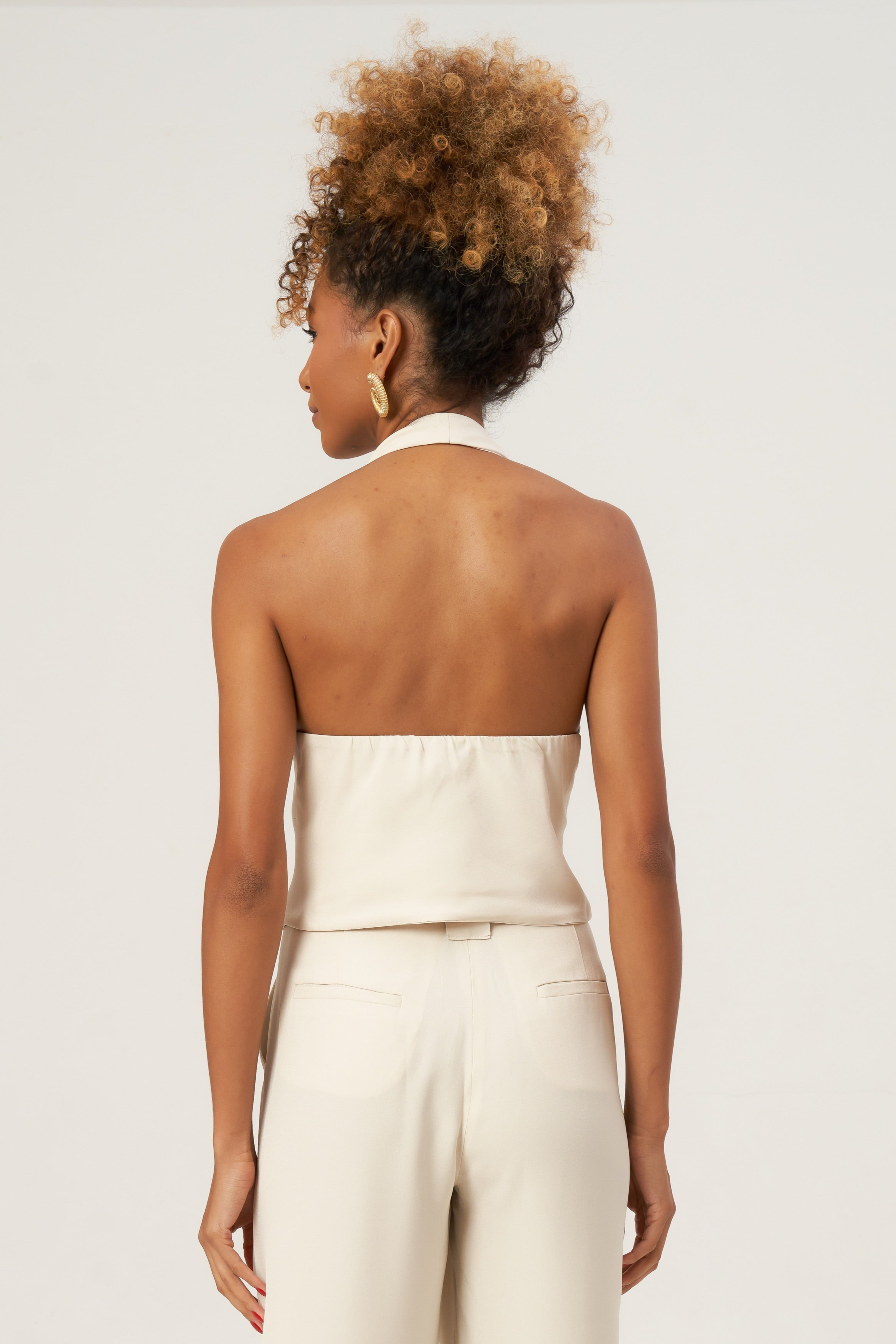 um colete frente única, de corte sofisticado e moderno, com elástico nas costas que proporciona um ajuste perfeito e confortável. O design é enriquecido por detalhes de botões de espiral, conferindo personalidade à peça um toque prático, sem perder o charme.