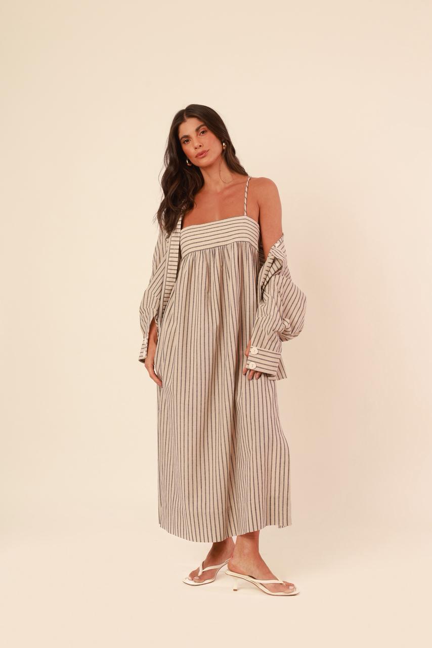 feito à mão por artesãs e artesãos brasileiros, esse vestido é pura leveza e elegância. com listras suaves e modelagem que valoriza o corpo com conforto, ele é confeccionado em tecido macio e fluido: 43% algodão, 43% viscose e 14% poliéster. perfeito para deusas que querem se sentir livres, lindas e autênticas.